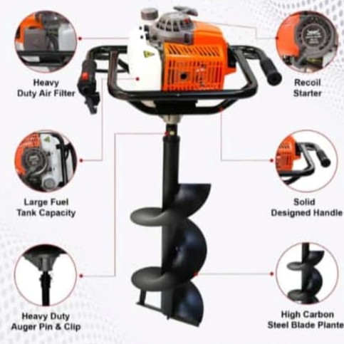 Efektyvus sunkiųjų sraigių srautas-su aukštos kokybės stipriu atnaujintu plieniniu rėmu, patvari pavarų dėže, tinkama vienam vyrui, o šis 2 taktų variklis Stiprus benzino žemės sraigtas 63cc 63 cc yra greitas sraigto greitis ir didelis efektyvumas, kai naudojami potholio ir kitos žemės ūkio ar pramonės atstovai.